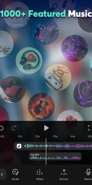 - يستطيع المستخدم القيام بإضافة مؤثرات صوتية داخل الفيديو من خلال ذاكرة الهاتف عن طريق برنامج filmorago مهكر، كما يمكن إزالة الصوت الأصلي وضبط الصوت حسب رغبته، كما يحتوي البرنامج على مكتبة كبيرة من أفضل أنواع الموسيقى التي يمكن استخدامها بسهولة.
