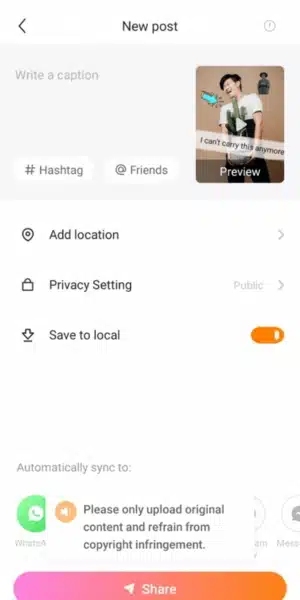- أي فيديو مميز داخل كواي الذهبي الاصدار الاخير يمكن للمستخدم أن يقوم بمشاركته على الكثير من منصات التواصل الاجتماعي، مثل الماسنجر والواتساب والانستقرام وتويتر من خلال الضغط على علامة مشاركة.