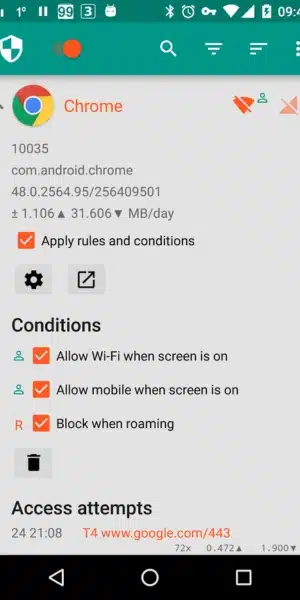 - يستطيع المستخدم الاستفادة من خاصية تخصيص الحظر داخل netguard مهكر الاصدار الاخير والتي يمكن من خلالها تحديد إما منع التطبيق من الوصول إلى شبكة الواي فاي أو البيانات الخاصة بالهاتف، وتتم عملية الحظر بسهولة عن طريق نقرة واحدة فقط من خلال واجهة سهلة الاستخدام بتصميم مبهر يمكن لأي شخص التعامل معها بدون أي قيود.
