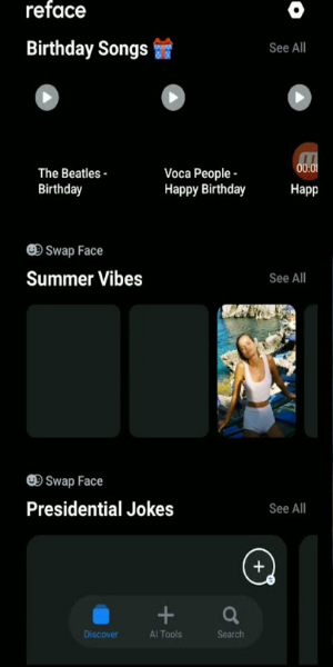 - أداة Swap Face: هذه الأداة التي تسمح للمستخدم بتبديل صورته مع صور المشاهير في مشاهد أو فيديوهات، ويمكن أيضا أن يتم دمج صورة المستخدم مع صورة الممثل المفضل لديه، أو تمثيل مشهد بينهم الاثنين في عالم افتراضي.