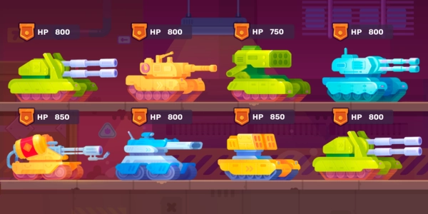 - يمكن للاعب أن يختار الدبابة التي يرغب فيها من بين عدد كبير من الدبابات التي تتنوع فيما بينها من حيث الشكل واللون والنوع، وكل دبابة لديها القدرات الخاصة بها.