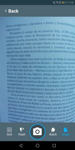 - شاشة المسح الضوئي وفيه يتم معاينة الكاميرا حيث تعرض ما تلتقطه الكاميرا مع إمكانية توجيه الجهاز لالتقاط المستند المطلوب إضافة لأزرار التحكم منها زر الالتقاط لالتقاط صورة للمستند – الفلاش لتشغيل أو إيقاف الفلاش حسب الحاجة – إعدادات الكاميرا لضبط الدقة والجودة.