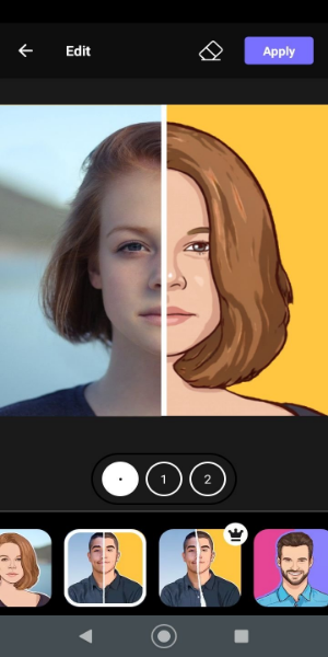 - بعد اختيار الصورة أو التقاطها سيتم توجيهك إلى شاشة التحرير وهنا تبدأ عملية تحويل الصورة إلى كرتون حيث يتم تطبيق التأثير الكرتوني تلقائيا عند تحميل الصورة.