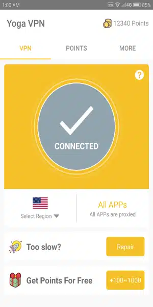 - عملية الاتصال بالإنترنت من خلال تطبيق Yoga VPN مهكر للاندرويد الاصدار الجديد تبدو بشكل مستقر، بسرعة كبيرة للحصول على أفضل تجربة ممكنة.